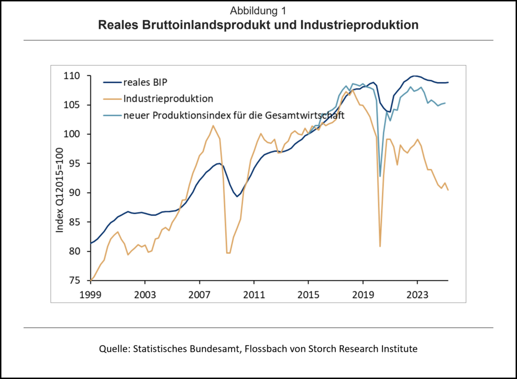 Es dürfte wenigen verborgen geblieben sein, dass der Standort Deutschland rasant an Attraktivität verloren hat. Seit 2019 kommt das Bruttoinlandsprodukt nicht mehr vom Fleck und die Industrieproduktion sinkt (siehe Abbildung 1). Auch für die Zukunft ist keine Besserung in Sicht. Der neue Index für die Gesamtwirtschaft, der die wirtschaftliche Entwicklung ohne den staatlichen Sektor (öffentliche Verwaltung, Gesund und Bildung) erfasst, ist hinter dem Bruttoinlandsprodukt zurückgeblieben.