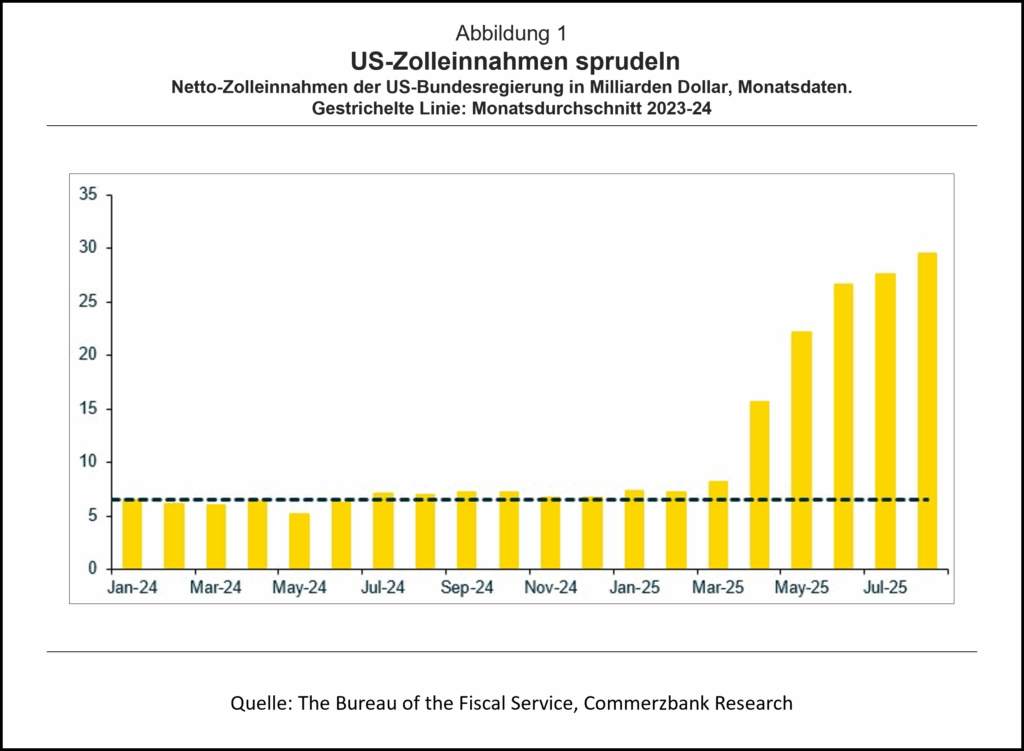Die protektionistische US-Zollpolitik macht sich mehr und mehr in steigenden Zolleinnahmen bemerkbar. Im August gingen beim US-Finanzministerium knapp 30 Mrd Dollar an Zöllen ein (Abb. 1). Diese Einnahmen werden in den kommenden Monaten wohl weiter steigen. Verschiedenen Schätzungen zufolge könnten sich die jährlichen Einnahmen mittel- bis langfristig bei etwa 400 Mrd Dollar einpendeln.