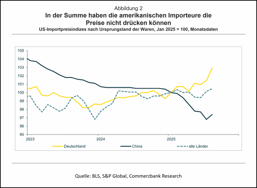 Allerdings gibt es gewisse Unterschiede, je nachdem aus welchem Land die Waren kommen. So sind die Preise für aus China importierte Waren seit Jahresanfang um etwa 3% gesunken, während sie für aus Deutschland importierte Produkte in den letzten Monaten leicht gestiegen sind. Die US-Importeure konnten also anscheinend ihre chinesischen Lieferanten zu gewissen Preiszugeständnissen bewegen, ohne dass dadurch die Belastung durch die Zölle auch nur annähernd ausgeglichen würde, die auf Importe aus China besonders hoch sind. Hingegen konnten deutsche Lieferanten solche Zugeständnisse bisher wohl weitgehend vermeiden, sodass die US-Importeure zumindest bis August den gesamten Zoll getragen haben.[1]