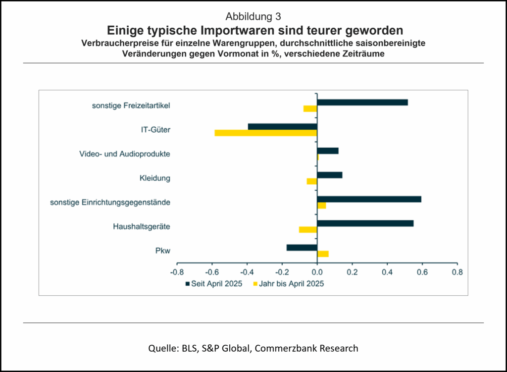 Während die ausländischen Lieferanten also bisher keinen nennenswerten Teil der Zölle tragen, waren die US-Unternehmen bei der Weitergabe der Belastung an die Verbraucher etwas erfolgreicher. Denn die Preisentwicklung bei einigen Warengruppen, die typischerweise – vor allem aus China – importiert werden, zeigt teilweise deutliche Zolleffekte. So haben sich Haushaltsgeräte seit April gegenüber dem Vormonat im Durchschnitt um 0,6% verteuert, während sie sich in den zwölf Monaten davor monatlich um etwa 0,1% verbilligt hatten (Abb. 3). IT-Güter verbilligten sich zuletzt zwar monatlich um 0,4%, womit sich ihr Rückgang aber von zuvor monatlich -0,6% verlangsamt hat. Kein Effekt ist hingegen bei den Preisen von Autos zu erkennen, dem wohl wichtigsten deutschen Produkt auf dem US-Markt. Diese sind seit April sogar etwas gefallen, während sie in den zwölf Monaten zuvor eher gestiegen waren.