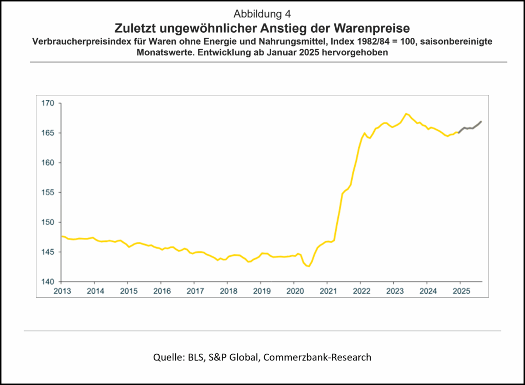Damit haben die höheren Zölle wohl dazu beigetragen, dass die Verbraucherpreise für Waren ohne Energie und Nahrungsmittel in den letzten Monaten gestiegen sind, während sie in den vergangenen zwanzig Jahren – abgesehen von dem starken Anstieg von 2020 bis 2023, der auf die Verwerfungen und Lieferschwierigkeiten während der Pandemie zurückzuführen – im Trend leicht gefallen sind (Abb. 4). Allerdings steigen die Preise bereits seit August 2024 wieder, als Trump noch nicht wieder Präsident war.