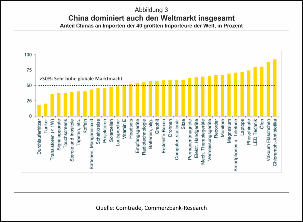 Insgesamt dominiert China vor allem die Elektrotechnik. Deutschland importiert beispielsweise aus der Volksrepublik jeweils bis zu zehn Milliarden US Dollar pro Jahr an Laptops und Smartphones, bzw. Telefontechnik und deckt damit einen Großteil seines Bedarfs. Zudem stammen etwa 65% der Smartphones sowie 84% der importierten Laptops aus China. Aber nicht nur in der Unterhaltungselektronik sind die chinesischen Importe wichtig. Auch viele Waren wie Touchscreens, Batterien, Radiotechnik, Computertechnik, Lautsprecher, Monitore und andere Elektronikwaren stammen mehrheitlich aus der Volksrepublik und werden in der deutschen Industrie benötigt. Neben der Elektronik spielen chinesische Lieferanten auch bei Permanentmagneten, bestimmten Antibiotika und anderen organischen Chemikalien und den Rohstoffen Graphit und Magnesium eine sehr bedeutende Rolle.