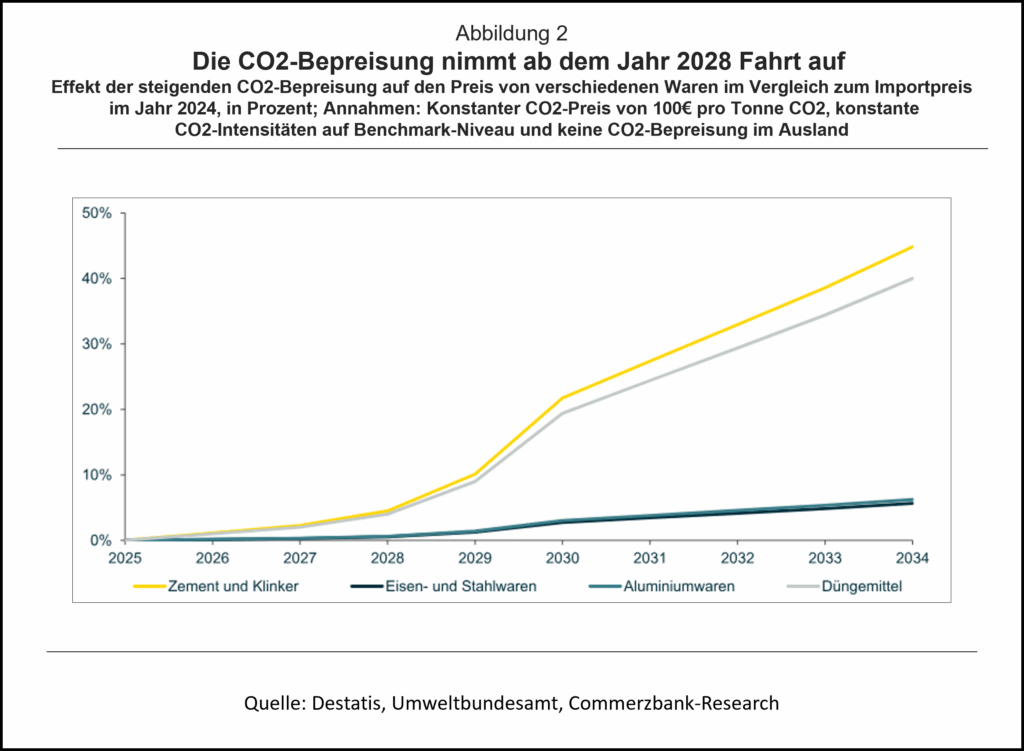 Das Rechenbeispiel zum Preisanstieg beruht zudem auf Schätzungen für die durchschnittliche CO2-Intensität der Produktion von Zement, bzw. Zementklinker (0,61 Tonnen CO2 auf eine Tonne Produkt), Stahl (1,62 T. CO2), Aluminium (1,82 T. CO2) und Düngemittel (1,60 T. CO2). Je nach exaktem Produkt und Herkunft der Ware kann die CO2-Intensität und der Importpreis stark abweichen. Darüberhinaus könnte die CO2-Intensität in Zukunft abnehmen. Dies ist in der Berechnung nicht berücksichtigt.