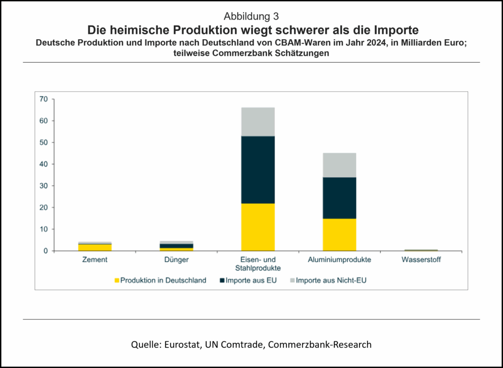 Aktuell wird über die Vor- und Nachteile von CBAM (Grenzausgleich) diskutiert. Diese Debatte wird den Belastungen für die deutschen Unternehmen aber nicht gerecht, weil sie die deutlich wichtigeren Nachteile des ETS 1 in diesem Zusammenhang nicht berücksichtigt. Schließlich betrifft der ETS 1 einen größeren Teil der deutschen Märkte für Zement, Düngemittel, Eisen-, Stahl- und Aluminiumprodukte als der CBAM. Der Großteil dieser Waren wird nämlich in Deutschland produziert oder aus Mitgliedsstaaten der EU bezogen (beides fällt unter den ETS 1, nicht unter CBAM; Abb. 3).
