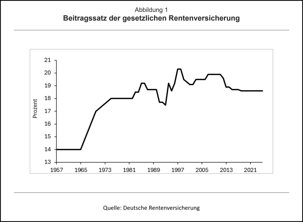 Als die gesetzliche Rentenversicherung 1957 in Form eines Umlagesystems geschaffen wurde, sprach man von einem Generationenvertrag nach dem Solidarprinzip. Der Zeitpunkt war günstig, weil bei einer wachsenden Bevölkerung mit 2,26 Kindern pro Frau nur 16 Ältere auf 100 Erwerbstätige kamen. Die Lebenserwartung lag bei 69 Jahren und das offizielle Renteneintrittsalter bei 65 Jahren. Der Beitragssatz für die Rentenversicherung wurde bei 14 Prozent (Abb. 1) und für die gesetzliche Krankenversicherung bei 7,3 Prozent des Bruttogehalts festgesetzt. Die gesamten Sozialbeiträge lagen bei 25 Prozent. Die Rente wurde um die 45 Prozent des durchschnittlichen Bruttogehalts fixiert.