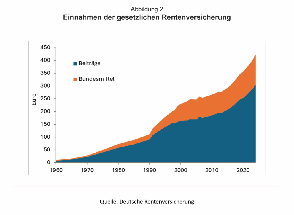 Die Zuschüsse für die gesetzliche Rentenversicherung aus Steuermitteln sind von 2,7 Milliarden Euro im Jahr 1960 (12 Prozent des Haushalts) auf 121 Milliarden (24Prozent) im Jahr 2025 gestiegen (Abb. 2). Mit den Leistungen für die Grundsicherung im Alter und bei Erwerbsminderung sind es 133 Milliarden. Hinzu kommen Zuschüsse in Höhe von 14,5 Milliarden für die gesetzliche Krankenversicherung, welche überproportional von den Älteren in Anspruch genommen wird. Die Umverteilung von Jung zu Alt über das Sozialsystem ist evident.