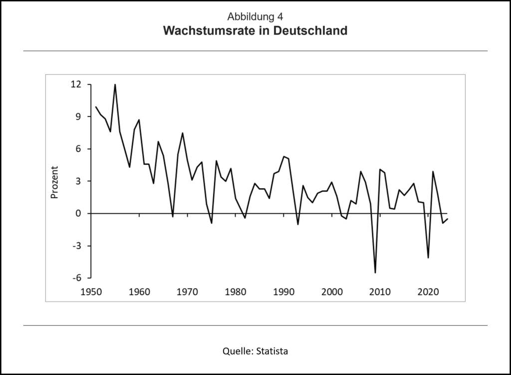 2024 lag das Wachstum hingegen bei -0,2 Prozent (Abb. 4). Seit 2019 sinkt die Industrieproduktion, weil die Politik seit der europäischen Finanz- und Schuldenkrise die Grundpfeiler der marktwirtschaftlichen Ordnung immer weiter außer Kraft gesetzt hat (Schnabl 2024). Der Euro hat stark an Wert verloren. Preiskontrollen haben sich auf dem Wohnungsmarkt breit gemacht. Indirekte Preiskontrollen sind durch massive Subventionen omnipräsent. Wuchernde Regulierung hat das Privateigentum und die Vertragsfreiheit eingeschränkt. Das Haftungsprinzip wurde durch weitreichende staatliche Rettungsaktionen für Banken und Unternehmen außer Kraft gesetzt. Die expansive Geld- und Finanzpolitik widerspricht dem Prinzip der Konstanz der Wirtschaftspolitik.