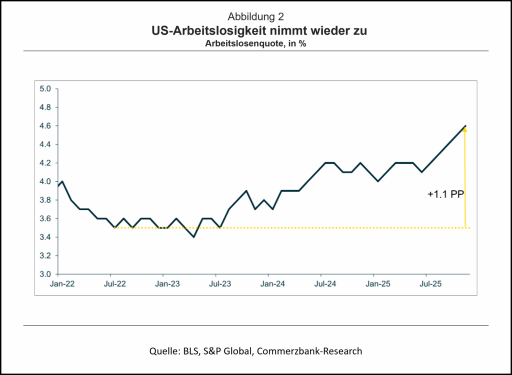Inzwischen hat die Arbeitslosenquote bereits gut 1 Prozentpunkt von ihrem sehr niedrigen Niveau 2022/23 aus zugelegt (Abb. 2). Wir erwarten, dass sie im Dezember bei 4,6% verharrte. Die Fed würde sich dann wohl weiter mehr um den Arbeitsmarkt als wegen der Inflationsrisiken sorgen. Sie bliebe damit grundsätzlich auf Zinssenkungskurs, auch wenn nach zuletzt drei aufeinanderfolgenden Schritten im Januar erstmal eine Pause wahrscheinlicher ist.