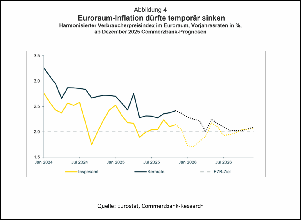 Auch die Kernrate sollte in den kommenden Monaten etwas nachgeben. Der Dezember macht mit einer Vorjahresrate von 2,3% (nach 2,4% im November) den Anfang. Auch in den darauffolgenden Monaten dürfte die Kernrate in sehr kleinen Schritten etwas abnehmen. Dafür spricht, dass der Lohnauftrieb nach einem starken Jahr 2025 langsam etwas nachlässt. Davon profitieren Unternehmen im Dienstleistungssektor maßgeblich, die die Preise für ihre Dienstleistungen im Umkehrschluss nicht weiter erhöhen müssen. Aus diesem Grund dürfte die Kernrate im Laufe von 2026 das EZB-Ziel von 2,0% erreichen.