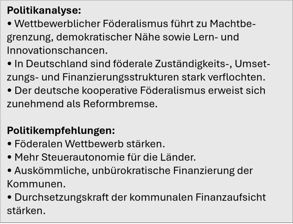 Das deutsche föderale System erweist sich zunehmend als Reformbremse. Eine strukturelle Ursache der mangelnden staatlichen Handlungsfähigkeit liegt in einem Mehrebenensystem, dessen Zuständigkeits-, Umsetzungs- und Finanzierungsstrukturen immer stärker verflochten wurden. Diese künstliche Komplexität erschwert klare Verantwortungszuordnung, erzeugt systemische Reformträgheit und begrenzt die Fähigkeit des Staates, zentrale Aufgaben effizient und wirksam zu erfüllen. Kurz: Deutschland befindet sich in einer Politikverflechtungsfalle, in der kollektive Verantwortungslosigkeit zu Erstarrung führt. Die wesentlichen Vorteile des Föderalismus – Machtbegrenzung, demokratische Nähe sowie Lern- und Innovationschancen durch institutionellen Wettbewerb – können so nicht zum Tragen kommen. Eine systematische Neujustierung hin zu einem stärker wettbewerblichen Föderalismus tut daher Not.