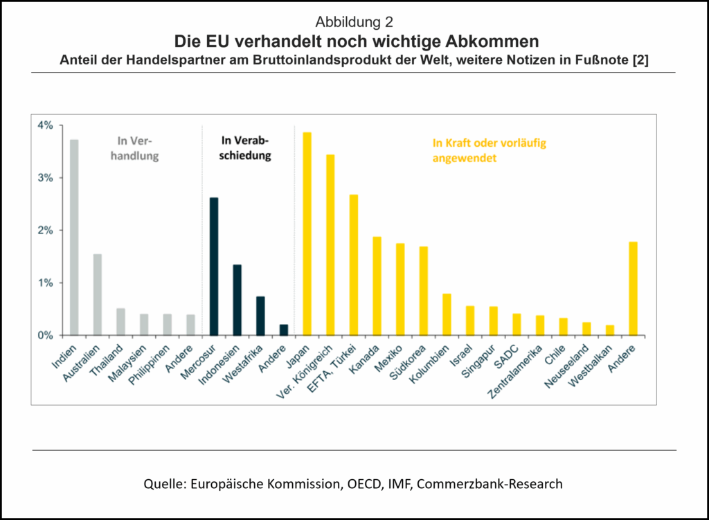 Vom Streit um das Mercosur-Abkommen lässt sich die EU-Kommission aber nicht abhalten. Vielmehr arbeitet sie an weiteren Handelsabkommen. Gemessen am Anteil des Partnerlandes an der Weltwirtschaft – und damit am Potenzial eines Abkommens – ist das Abkommen mit Indien das wichtigste, für das die Verhandlungen sich wohl auf der Zielgeraden befinden (Abb. 2). Verhandelt werden zudem Abkommen mit Australien und den südostasiatischen Ländern Thailand, Malaysia und die Philippinen. Wie das Mercosur-Abkommen sind Abkommen mit Indonesien und Westafrika (darunter das bevölkerungsreiche Nigeria) zwar bereits verhandelt, aber sie müssen noch durch den EU-Rat oder das EU-Parlament verabschiedet werden.