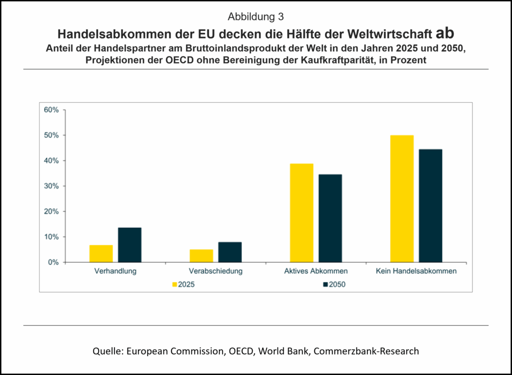 Die neuen Handelsabkommen (zu verhandelnde und zu verabschiedende Abkommen) haben zweifelsohne das Potenzial, den deutschen Export zu stützen. Derzeit erwirtschaften diese Länder etwa 12% des weltweiten Bruttoinlandsprodukts. Und in vielen dieser Länder – allen voran Brasilien, Indien und südostasiatische Staaten – dürfte die Wirtschaft in den kommenden Jahren kräftig wachsen. Nach Schätzungen der OECD wird ihr Anteil an der Weltwirtschaft bis zum Jahr 2050 auf 21% steigen (Abb. 3). Die Handelsabkommen werden es den deutschen Unternehmen erleichtern, von diesem Wachstum zu profitieren. Insgesamt decken die aktuellen und zukünftigen Handelsabkommen bereits jetzt gut die Hälfte der Weltwirtschaft ab, und ihr Anteil wird in den kommenden Jahren wachsen.