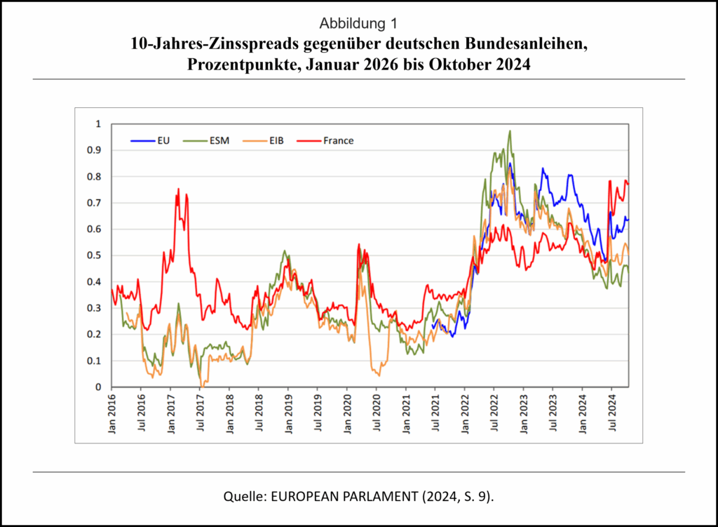 Die erwünschten Finanzierungsvorteile von Eurobonds sind bislang ausgeblieben. Abb. 1 zeigt die Zins-Spreads von EU-Bonds, Wertpapieremissionen anderer EU-Institutionen (Europäischer Investitionsbank EIB, Europäischer Stabilitätsmechanismus ESM) sowie französischer Anleihen gegenüber deutschen Bundesanleihen. Es wird deutlich, dass supranationale Emissionen teuer sind; die Zinskosten von EU-Emissionen lagen zeitweise selbst über denen Frankreichs. Der EU-Zins-Spread übersteigt auch den (hier nicht dargestellten) Spread der Niederlande, und hat sogar den Spread Spaniens übertroffen (Bonfanti, 2025).