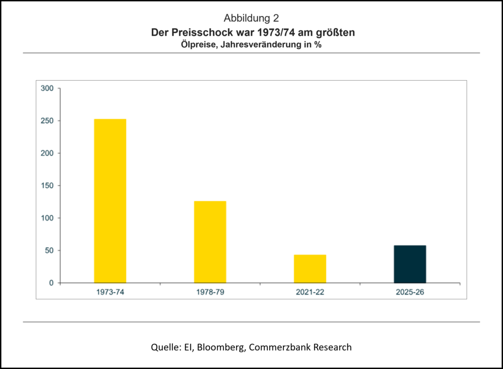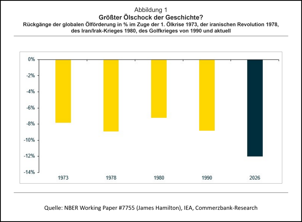 Tatsächlich ist die Ölförderung wegen der Sperrung der Straße von Hormus und der Angriffe auf Ölförder- und Verladeanlagen in der Region rund um den Persischen Golf stärker zurückgegangen als in den anderen Ölkrisen der letzten 50 Jahre. So ist die tägliche Förderung von Rohöl seit Beginn des Iran-Kriegs laut IEA vermutlich um mindestens 10 Millionen Barrel gefallen. Dies entspricht rund 12% der globalen Ölförderung. Bei den großen Ölschocks der Vergangenheit verringerte sich die Förderung hingegen „nur“ um 7 bis 8% (Abb. 1).