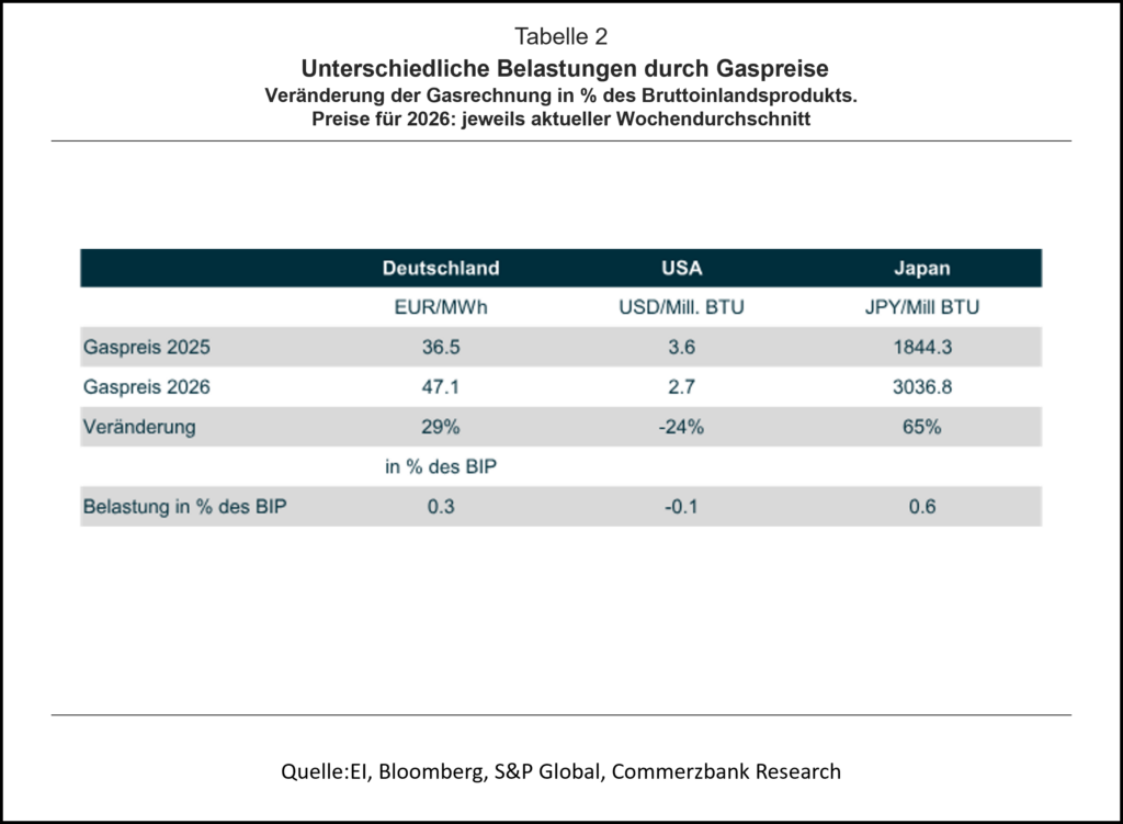 Für eine grobe Abschätzung der Auswirkung der gestiegenen Gaspreise verwenden wir die jeweiligen Großhandelspreise. So ist der für Deutschland maßgebliche Preis (TTF) zuletzt auf knapp 50 Euro je Megawattstunde gestiegen. Gegenüber dem Durchschnittspreis von 2025 ist dies ein Anstieg von rund 30%. Fällt der Preisanstieg im Jahresdurchschnitt 2026 ähnlich hoch aus – wofür der Preis in den kommenden Wochen noch etwas steigen müsste – würde der Anstieg von Deutschlands Gasrechnung rund 0,3% des Bruttoinlandproduktes entsprechen (Tabelle 2). Härter trifft es Japan mit einer doppelt so hohen Belastung. In den USA liegen die Gaspreise aktuell sogar unter dem Durchschnitt des Vorjahres, sodass die Verbraucher hier nicht belastet, sondern sogar entlastet werden.