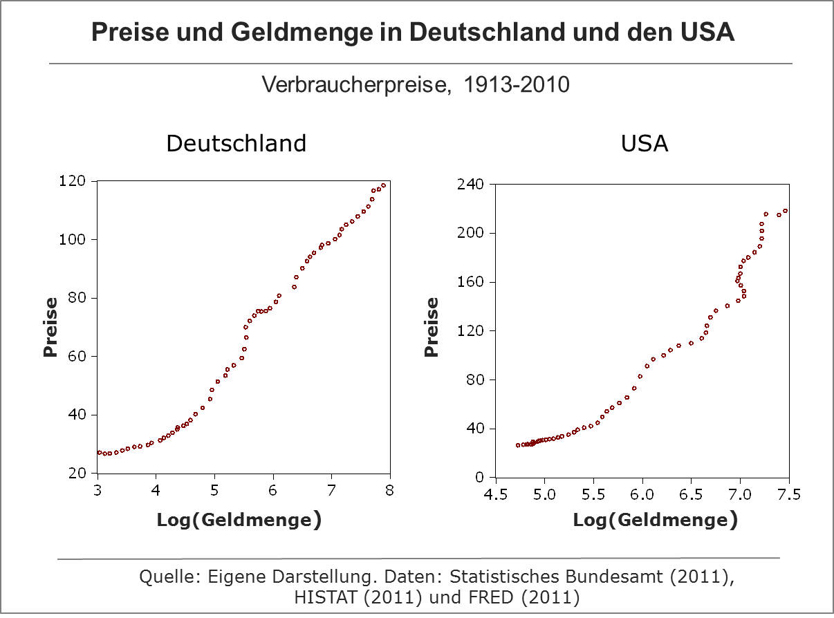 Ein Blick auf die USA und Deutschland zeigt: Der Anstieg der Geldmenge und der Anstieg der Güterpreise sind eng korreliert. Höhere Geldmengen und höhere allgemeine Preisniveaus gehen Hand in Hand. Das gilt für den gesamten Zeitraum zwischen 1913 und 2010. Wuchs die Geldmenge stark, schlug sich das über kurz oder lang auch in einem starken Anstieg des allgemeinen Preisniveaus nieder. Nachhaltige Prozesse der Inflation sind sowohl in Deutschland als auch den USA monetärer Natur. Die Empirie zeigt auch eindeutig, dass Inflation in beiden Ländern immer wieder eingesetzt wurde, um Arbeitslosigkeit zu verringern. Die Phillips-Kurve war nie wirklich tot, die Politik konnte mit „dummen“ Bürgern rechnen. Daneben war die „Inflationssteuer“ immer auch ein beliebtes Instrument, Defizite im staatlichen Haushalt zu finanzieren. Der Widerstand der Bürger gegen die schrecklichste aller Steuern, die „Inflationssteuer“, war geringer als gegen reguläre Steuern.