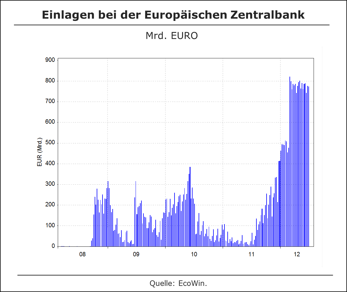 Auch der Hinweis darauf, dass durch die Senkung des Einlagenzinses auf 0 Prozent die Einlagen bei der EZB unattraktiver würden, ist wenig überzeugend. Grund für die Einlagen bei der EZB sind wohl weniger die zu erzielenden Zinsen, die auch bisher mit 0,25 Prozent bereits sehr niedrig lagen, sondern das mangelnde Vertrauen in andere Banken und damit die Funktion der EZB als „sicherer Hafen“. Es ist also der Sicherheitsaspekt, der gegenwärtig dazu führt, dass der geringe Zinsertrag überkompensiert wird und – wie Abbildung 1 zeigt – die Bankeinlagen bei der EZB in der jüngsten Vergangenheit auf über 800 Mrd. Euro ansteigen ließ. Diese Einlagenhöhe ist mehr als doppelt so hoch als nach der Lehman-Pleite im September 2008 und zu Beginn der Staatsschuldenkrise 2010. Hierdurch werden die tiefe Verunsicherung im Bankenbereich und die Zerrüttung des Interbankenmarktes deutlich, denen sicherlich nicht durch eine Zinssenkung um 0,25 Prozentpunkte begegnet werden kann.